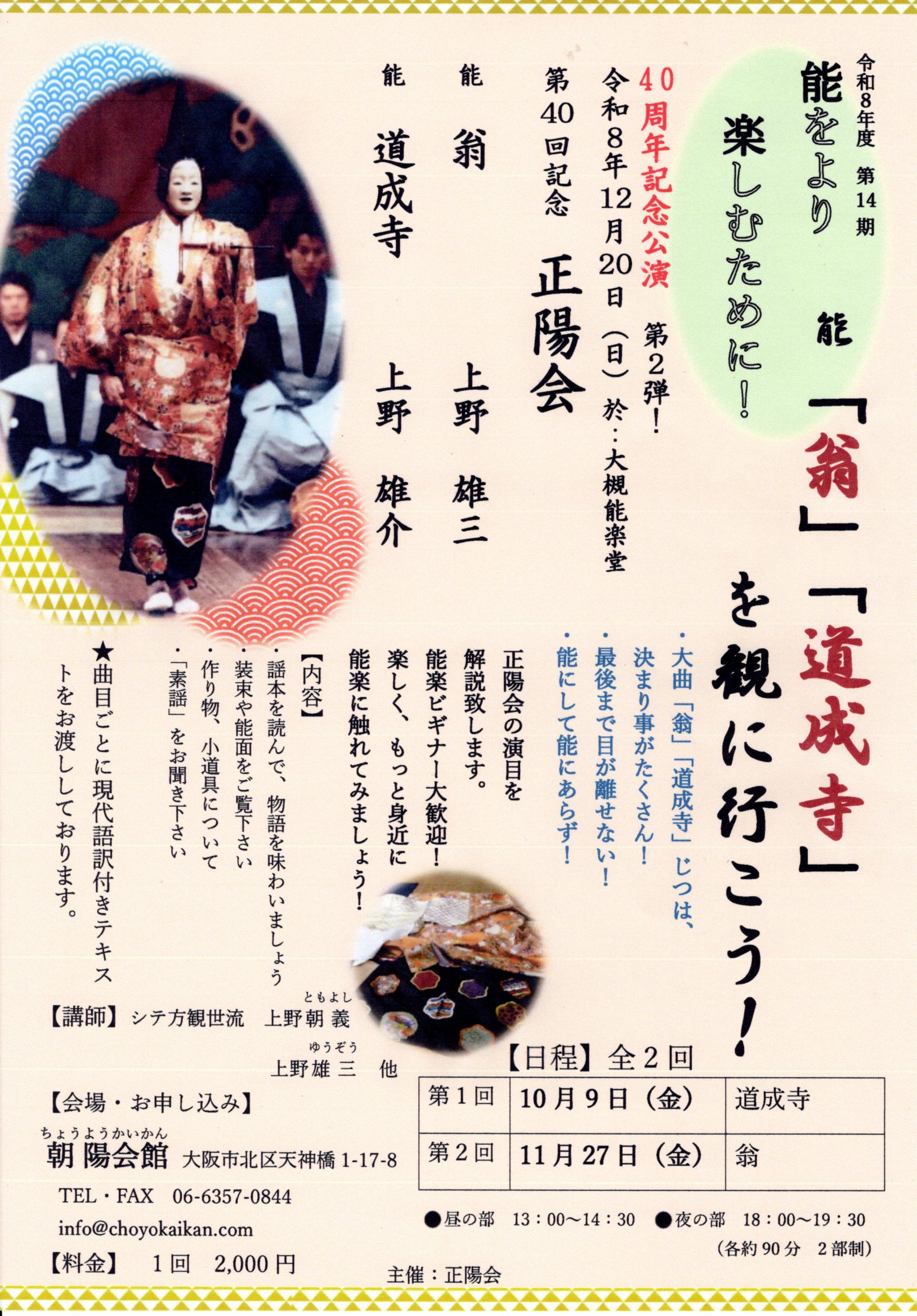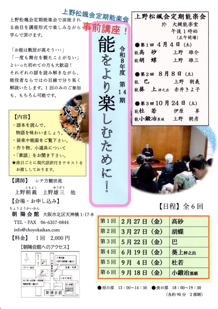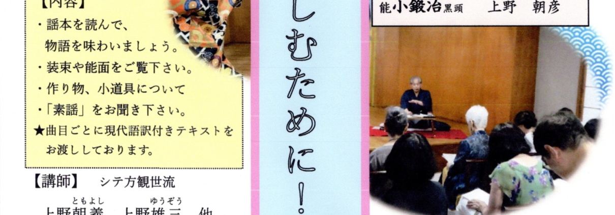 上野朝義・雄三が主催する正陽会(しょうようかい)をはじめ、年間3回開催している上野松颯会(うえのしょうさつかい)定期能楽会で演能される曲目を1年を通して、講座形式で楽しみながら学んで頂けます。